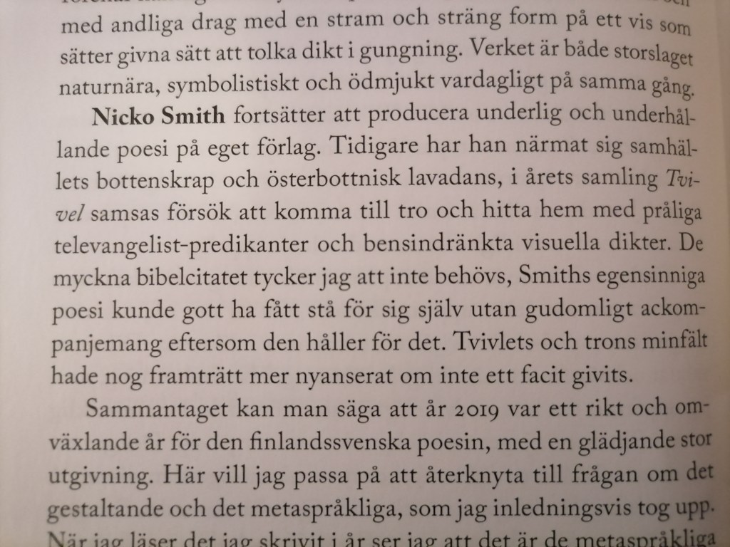 Jenny Jarlsdotter Wikström tycker till om min diktsamling Tvivel i Finsk Tidskrift 3-4/2020, där hon summerar det finlandssvenska utbudet av poesi 2019…