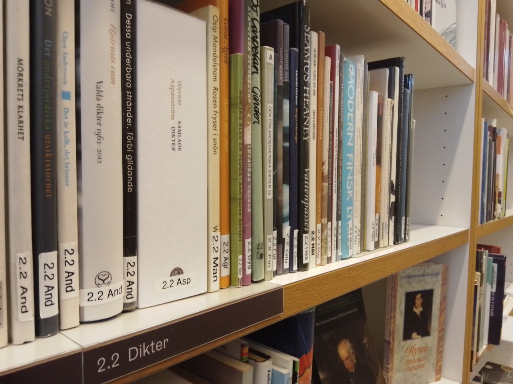 Som ni själv kan bevittna, så finns ändå en hel del kvalitativa diktsamlingar på plats, även om jag saknar ett bredare utbud samt fler böcker från Sverige. Ändå är det här det bästa utbudet av de tre bibliotek som jag besökt hittills i Helsingfors och vi får se vad andra bibliotek i trakten har att bjuda på.