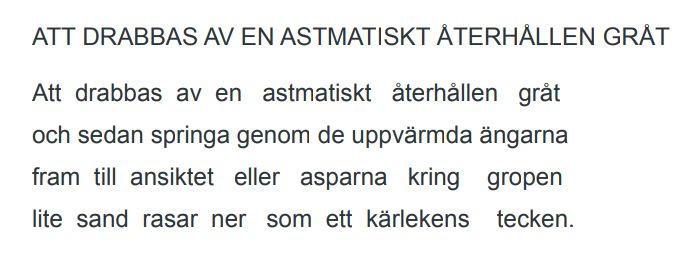 – Med poesismak är det lite på samma sätt som med musiksmak. Ibland tilltalar gamla verk och ibland samtida verk. Vad som är bra poesi är en ytterst personlig fråga och för varje människa kan det ändra sig från år till år. Någonting som är tragiskt är i varje fall det faktum att etablerade förlag i dag publicerar mycket mindre poesi än tidigare.