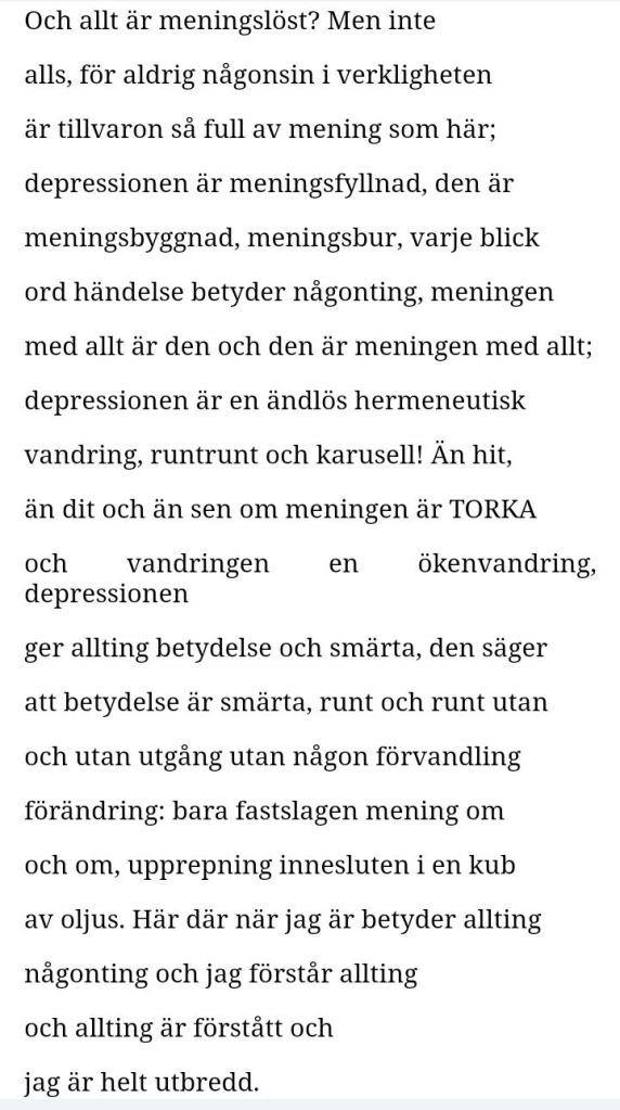 Att skriva poesi som erbjuder sådant kräver distans; en möjlighet att befinna sig utanför depressionen, ensamheten o.s.v. och att där utifrån kunna beskriva det som sker. I Misslyckad i en uggla finns bara innanför: depressionen är en bur.