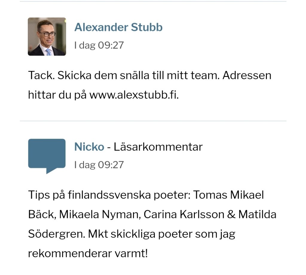 Lyckades fråga Alexander Stubb nu i morse i en chatt på Hufvudstadsbladet om hans relation till finlandssvensk poesi och fick svar direkt. Fick även möjlighet att tipsa honom om några finlandssvenska poeter som jag uppskattar (inte så lätt att välja några, när det finns så många bra och givetvis ska det stå Matilda Södergran och inte Södergren..)