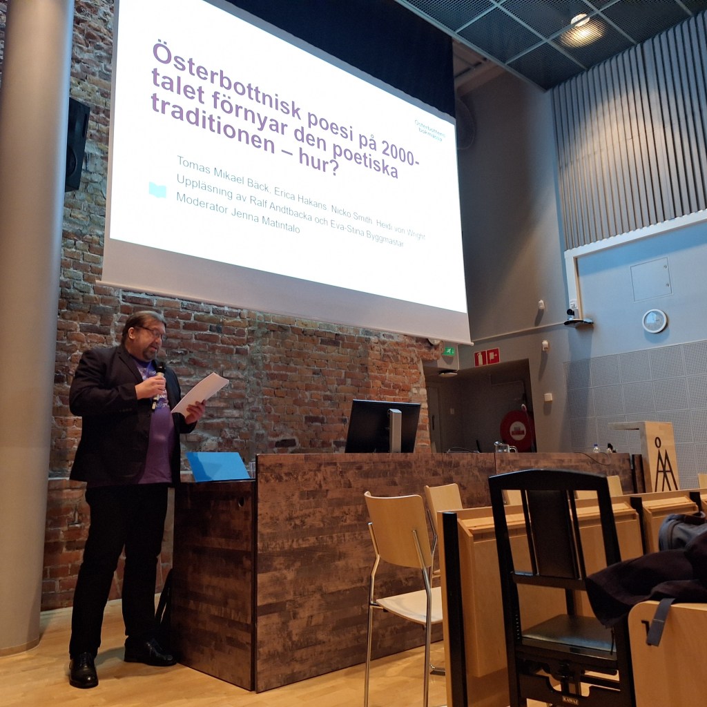 Då var dagens diskussion om österbottnisk poesi avklarad på Academill i Vasa. Det blev en intressant pratstund med poeterna Tomas Mikael Bäck, Erica Håkans, Heidi Von Wright. Jenna Matintupa ställde bra frågor och det var en givande stund med mycket publik.