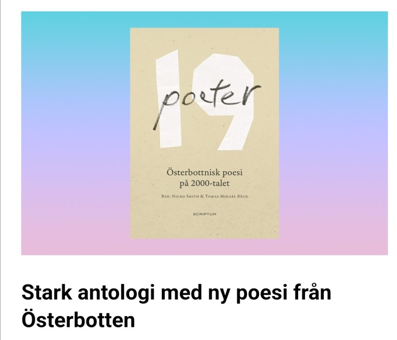 ”Den österbottniska poesin är i dag väldigt mångfasetterad. Den är modern, individuell och experimenterande. Den är en blandning av skuggor från den forna landsbygden och en ultramodern experimenterande lyrik./ Nicko Smith och Tomas Mikael Bäck har lagt ner ett jättejobb och fått ihop en väldigt fin antologi med ny österbottnisk poesi. Jag ska absolut fördjupa mig i en del av de för mig nya författarskapen, som väckt min nyfikenhet.”