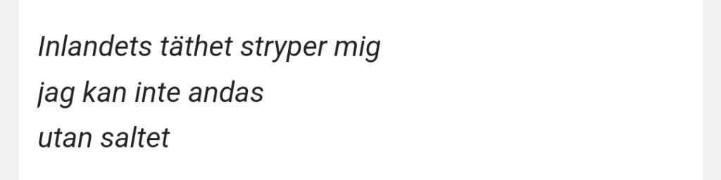 De tunga partierna vägs upp av andningspauser i form av sällsynt träffsäkra dikter om att vara finlandssvensk. En stor majoritet av de kustberoende jag känner skulle skriva under följande: