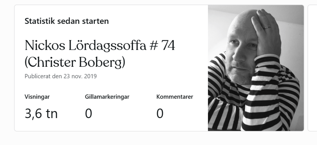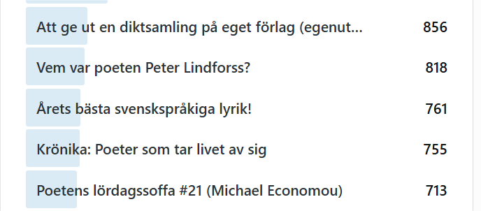 På förstaplats (med en rejäl marginal) hittar vi intervjun med Christer Boberg från projektet Lördagssoffan där jag intervjuade 100 poeter, författare och musiker om vad poesi är för dem. Christer har fått överlägset flest röster och har ni missat intervjun med honom kan ni läsa den här:
